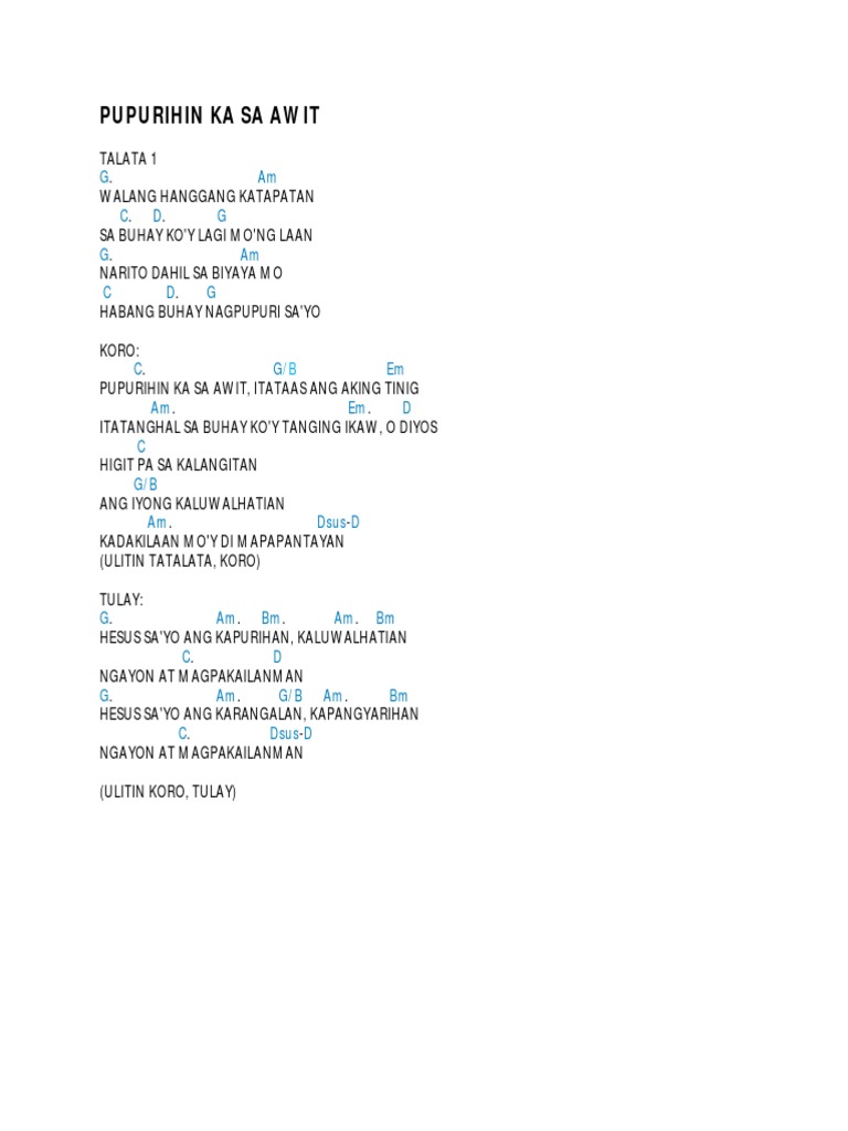 Pupurihin Ka Sa Awit by Musikatha PUPURIHIN KA SA AWIT TALATA 1 G. C walang hanggang katapatan am. Never believe you are l.