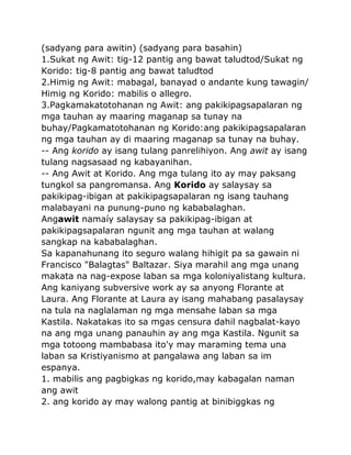 Ibong Adarna Laura de Lara 3. Dalit o Imno - Awit ng papuri luwalhati kaligayahan o pasasalamat karaniwang para sa Diyos 4. Ang mga mamamayan dito ay nagsasalita ng Bikol pero iba-ba ang uri ng Bikol nila.