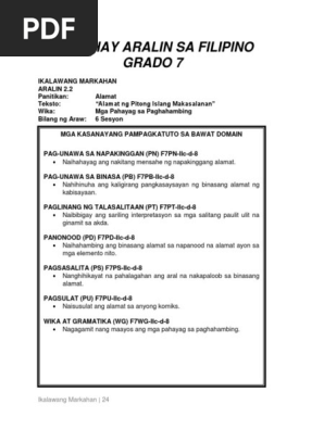 FILIPINO 7 IKALAWANG MARKAHAN ARALIN 21. Pareho rin na iilang Pilipino na lang ang nakakaalam ng mga ito dahil sa makabagong henerasyon na mayroon na tayo. Umuulan man sa bundok Umuulan man sa bundok Huwag sa dakong laot Aba si Kasampalok Nanaw nang di ko loob Wala ni baong kumot.