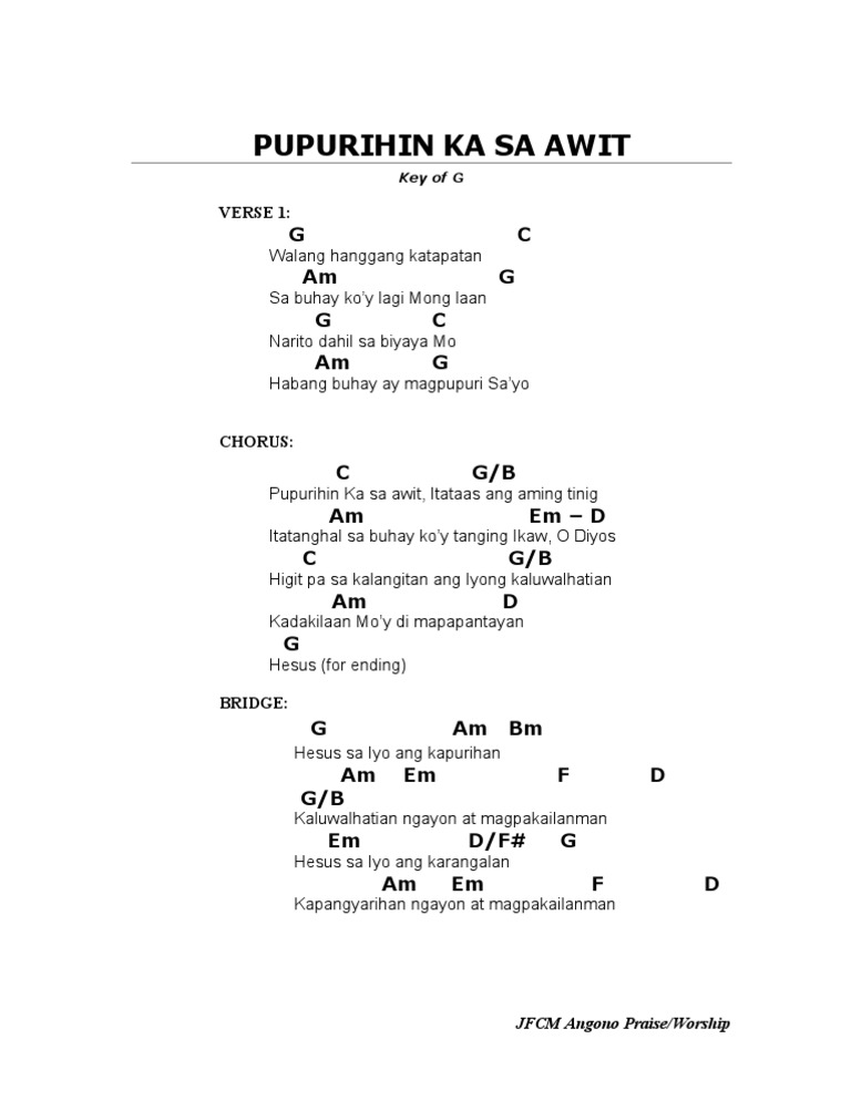 G PUPURIHIN KA SA AWIT Eb G ITATAAS ANG AKING TINIG Fm ITATANGHAL SA BUHAY KOY Cm Bb TANGING IKAW OH. Bb PUPURIHIN KA SA AWIT F A ITATAAS ANG AKING TINIG Gm ITATANGHAL SA BUHAY KOY Dm C TANGING IKAW OH DIOS Bb HIGIT PA.