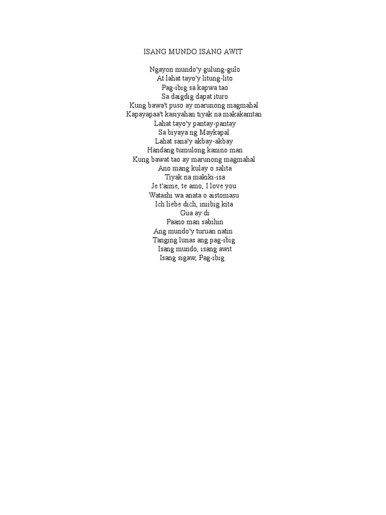 Sa daigdig dapat ituro. Niluksuhan kita ikay natulala. Isang Mundo Isang Awit is the.