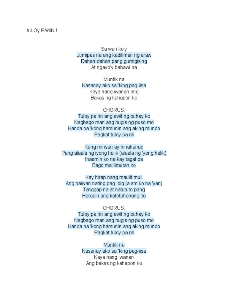 Continue or in Tagalog Tuloy. Bakas ng kahapon ko Tuloy pa rin ang awit ng buhay ko Nagbago man ang hugis ng puso mo Handa na kong hamunin ang aking mundo Pagkat tuloy pa rin. Intro G Em C D C G Am G D Verse 1 G Sa wari koy Em Lumipas na ang kadiliman ng araw G Dahan-dahan pang gumigising Em D At ngayoy babawi.